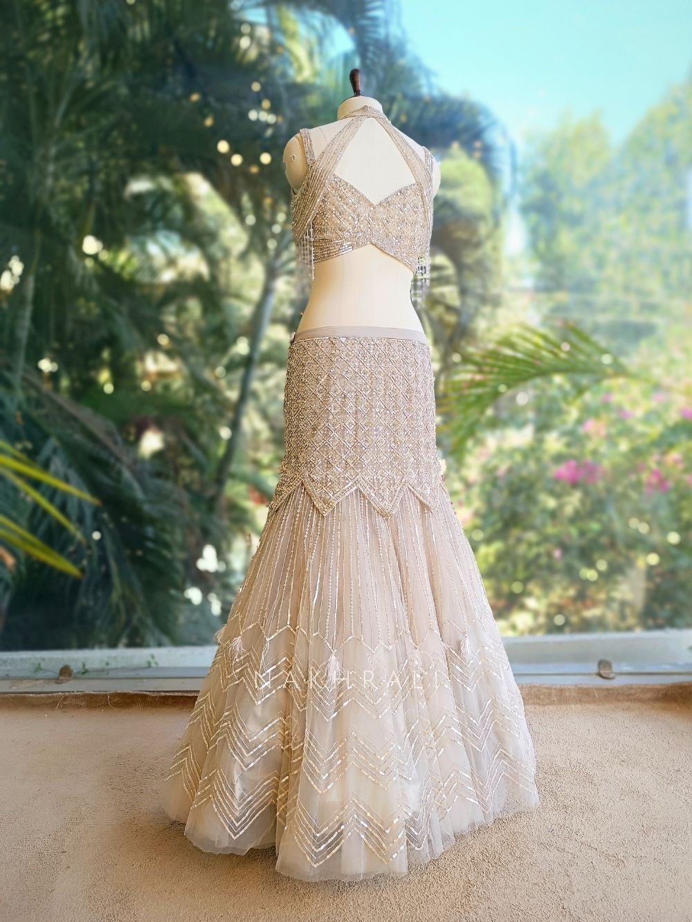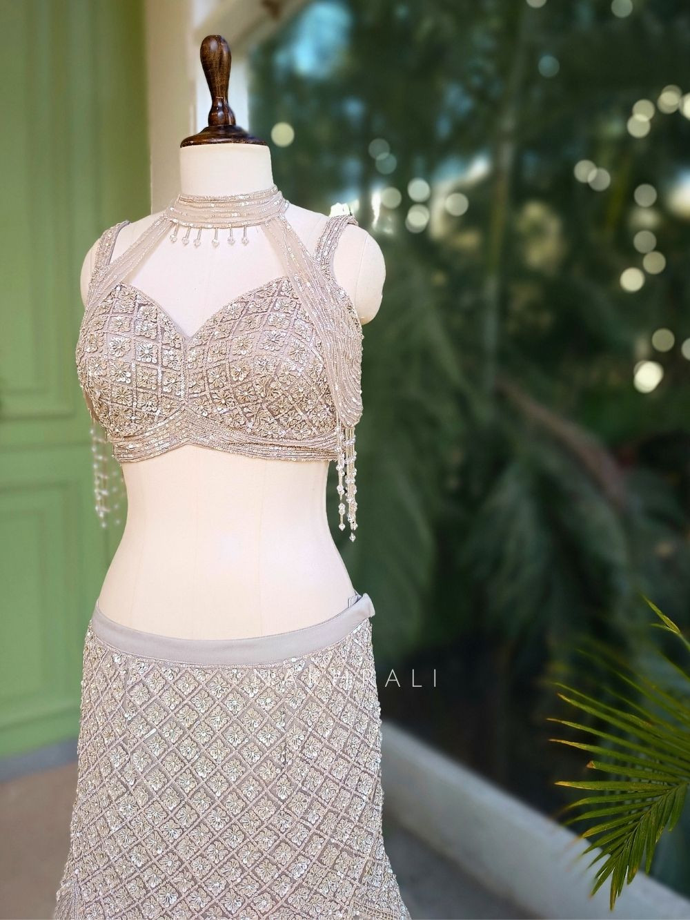 This grey indo-western set is crafted to balance elegance and edge. The outfit features dense sequin and cut dana work spread evenly across the silhouette, creating a refined shimmer without looking heavy. The structured blouse and flowing lower panel come together for a modern festive look that feels graceful yet bold. Ideal for cocktail nights, receptions, and contemporary celebrations where understated luxury stands out.