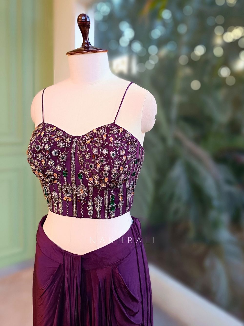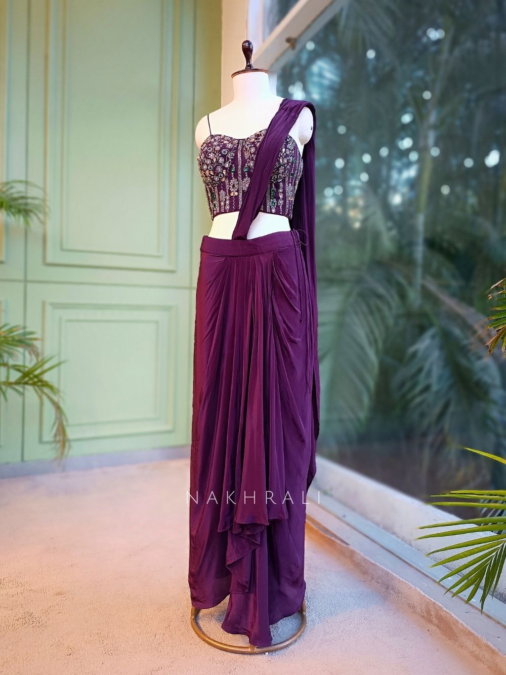 This wine pre-draped saree is crafted for women who want impact without effort. The fluid drape falls gracefully with a soft, gathered silhouette that moves beautifully while staying structured. It is paired with a statement blouse featuring intricate cut dana embroidery highlighted with multicolour stone accents and delicate sequin detailing. The blouse comes with a sweetheart neckline, thin shoulder straps, and a lace-up back for a custom fit. This indowestern saree blends contemporary styling with festive richness, making it a standout choice for cocktail events, receptions, and evening celebrations where elegance matters.