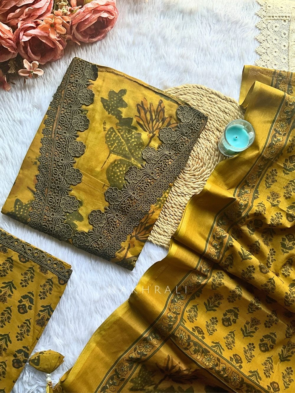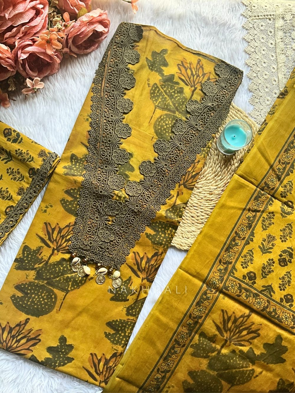 This mehendi green dress material is designed for lovers of subtle, rooted elegance. The kurta fabric showcases a soft floral print inspired by nature, enhanced with beautifully crafted lace work along the neckline that adds texture and depth. Delicate shell and coin-style accents complete the neckline with a handcrafted touch. Paired with a matching printed dupatta and coordinated bottom fabric, this set is ideal for festive mornings, casual celebrations, and intimate gatherings where understated style makes the strongest impression.