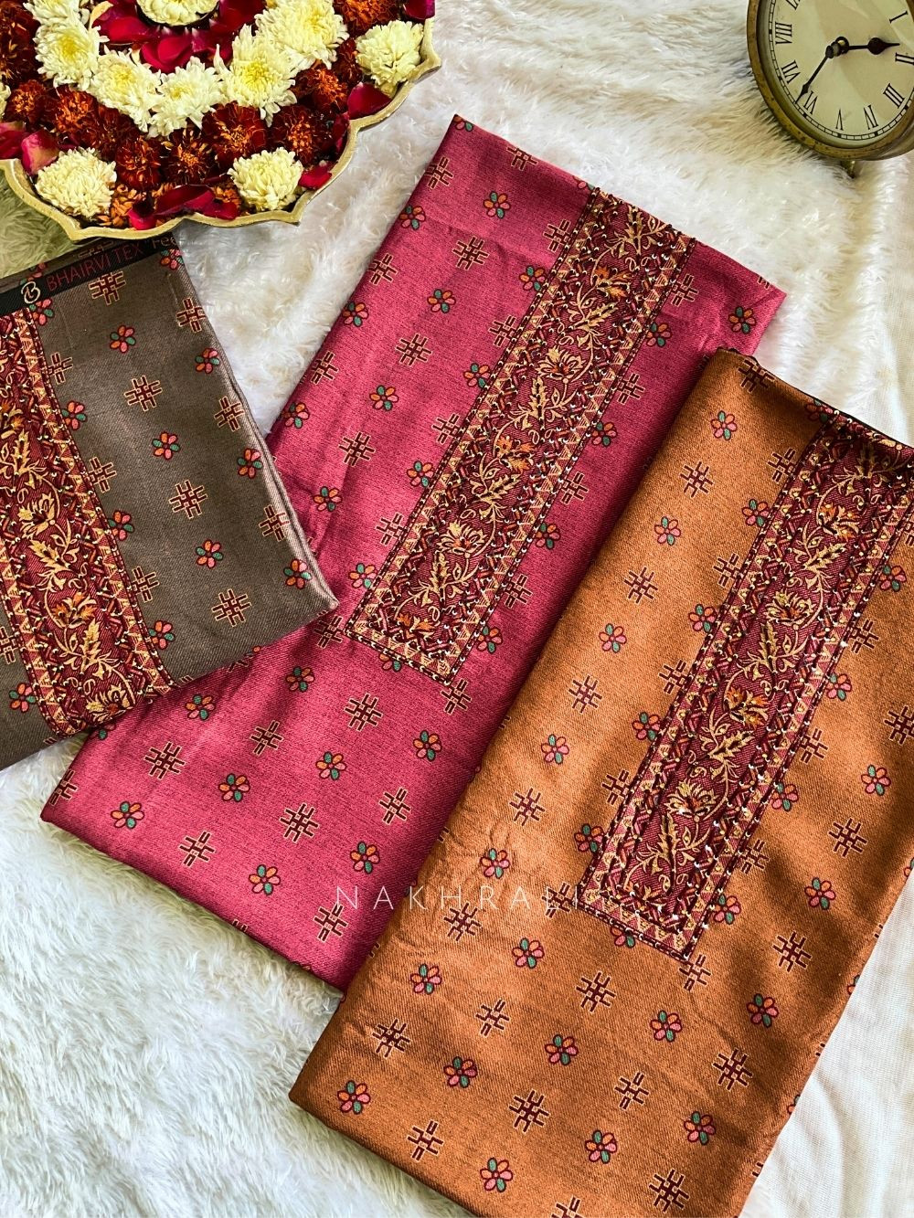 This woolen dress material brings together warmth, comfort and traditional artistry. The fabric feels soft and cozy, ideal for winter days, while the beautifully detailed ethnic print adds richness and vibrance to the outfit. Designed for a graceful fall and easy tailoring, it is perfect for daily wear, casual outings and winter festivities. A timeless addition for those who love heritage prints blended with modern comfort.