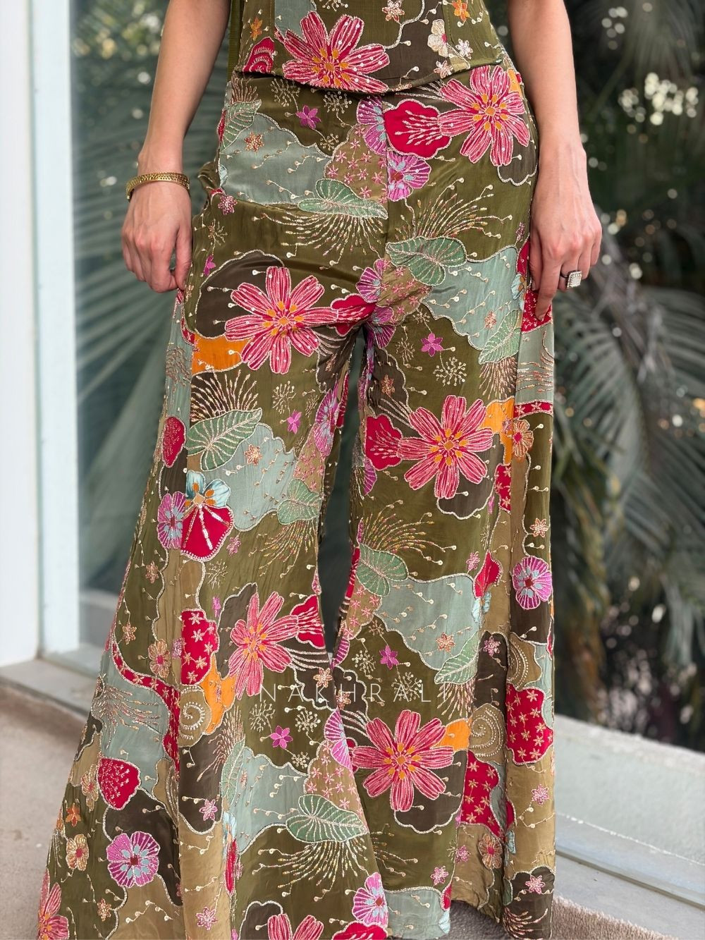 This indo-western set is crafted with intricate zari and sequin embellishments that add richness without overpowering the silhouette. The design blends traditional embroidery with a modern cut, making it ideal for festive gatherings, celebrations, and evening events. The coordinated styling allows effortless dressing while maintaining a refined and confident look suitable for special occasions.