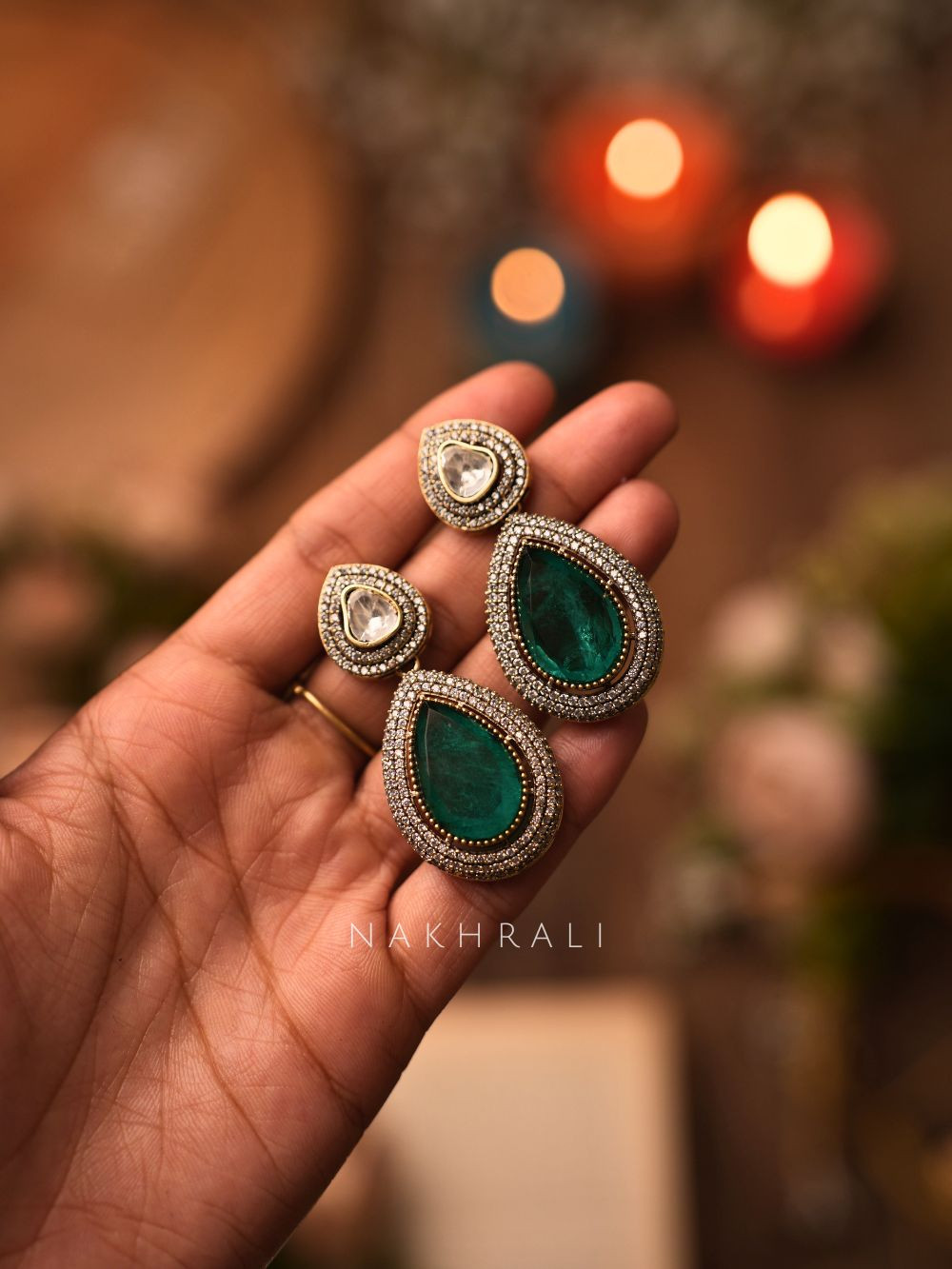 Zara Green Polki Statement Necklace Set with Teardrop Stones