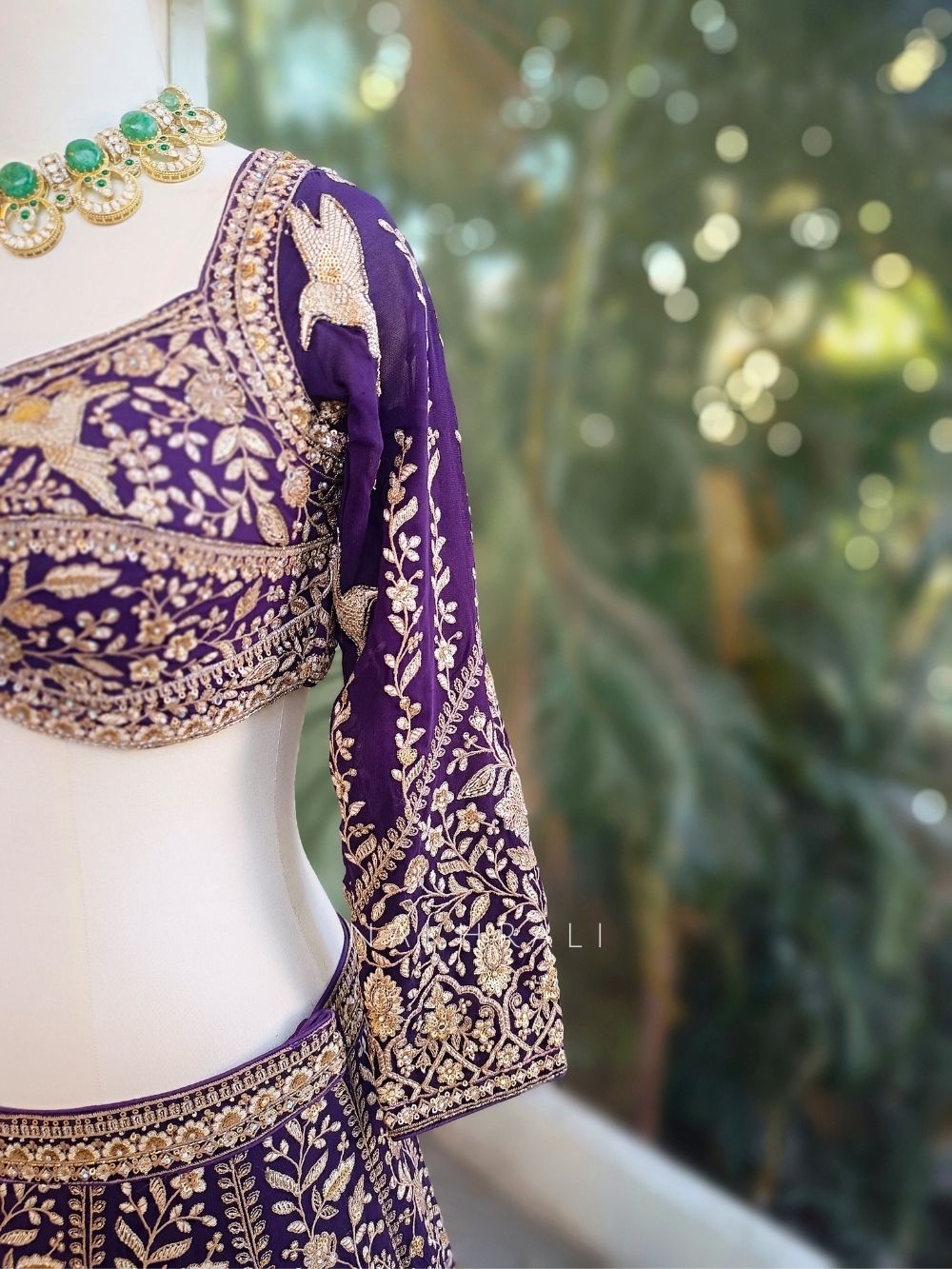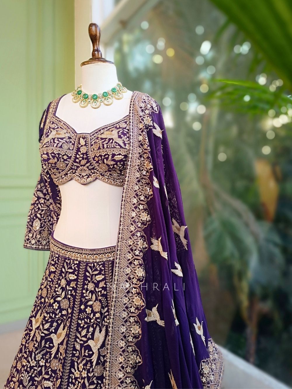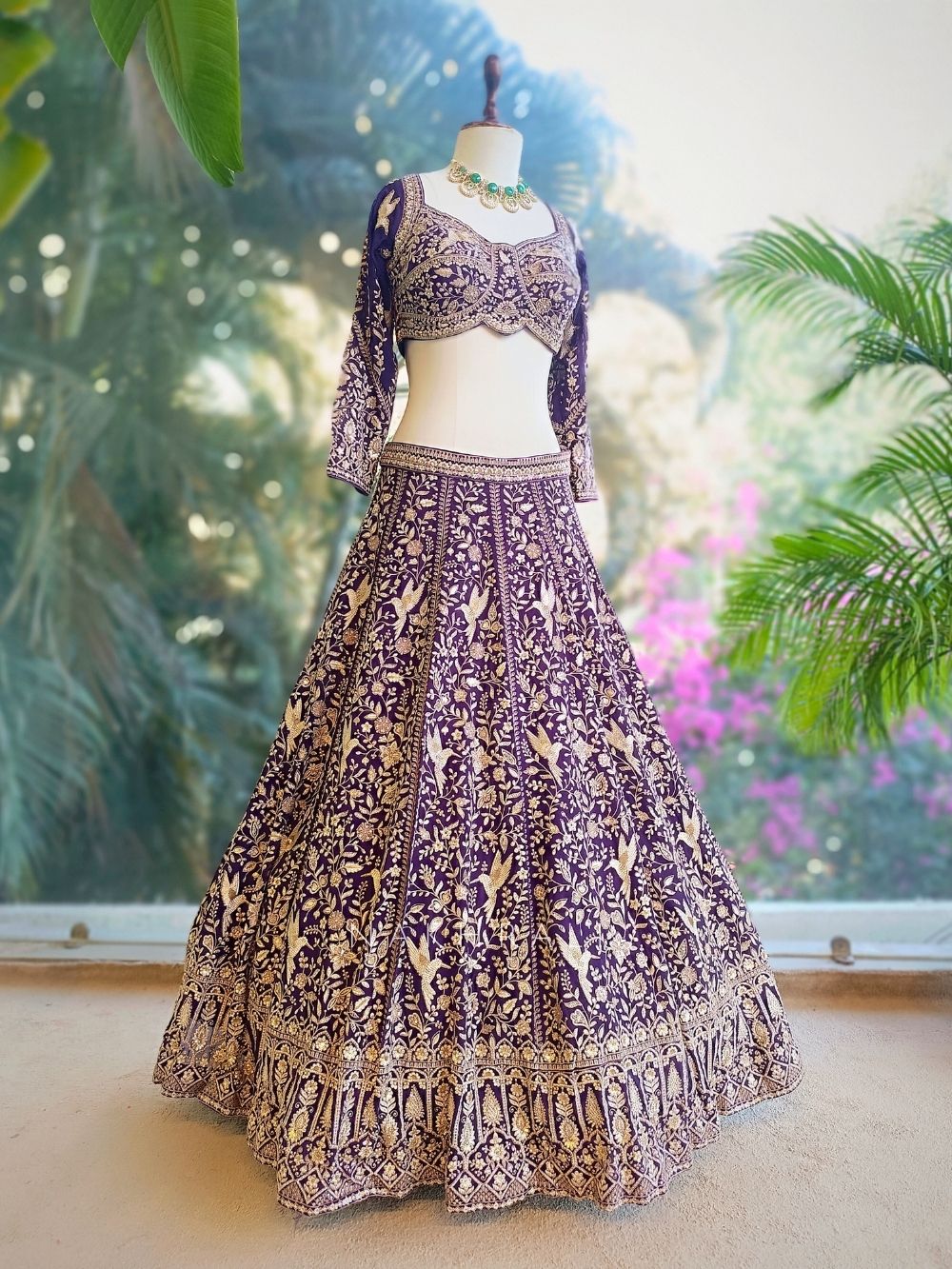 This purple lehenga set includes a richly embroidered lehenga skirt, a fitted blouse, and a coordinated dupatta. The blouse stands out with its beautifully shaped neckline highlighted by detailed thread and sequin embroidery, extending gracefully onto the sleeves. The lehenga skirt is adorned with dense floral and bird-inspired threadwork, finished with an ornate embroidered hem that adds depth and movement. The dupatta features scattered embroidered motifs and a detailed border, completing the look with elegance. Ideal for weddings, sangeet nights, and grand festive occasions where a refined yet striking ensemble is desired.