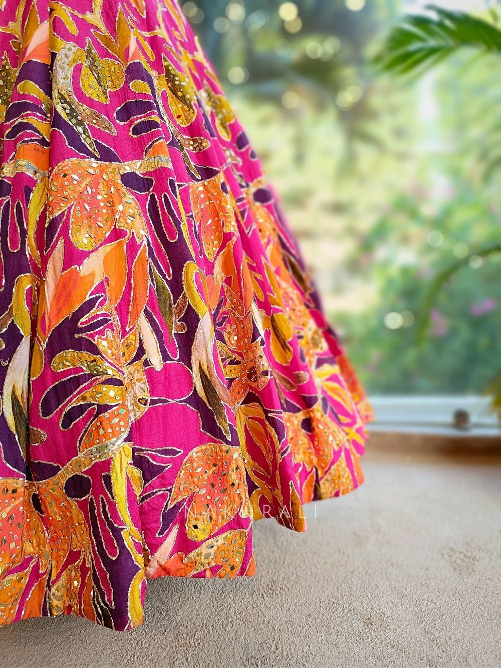 Zarina is a lively magenta silk-blend lehenga designed with bold festive prints that create a striking flair for celebrations. The highlight is its intricately handcrafted blouse adorned with fine sequin and cut-dana work, adding a glamorous shimmer from every angle. Paired with a soft gradient dupatta sprinkled with delicate embellishments, this set is ideal for sangeet nights, haldi-meets-mehendi celebrations, and modern festive gatherings. A statement choice for the woman who loves vivid artistry.