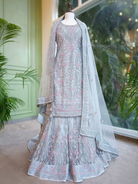 The Zariya Grey Bridal Set is a vision of elegance, blending a full-sleeved long kurta with a grand trail skirt that flows like a dream. Hand-embellished with fine sequin and beads work on delicate net fabric, this ensemble captures soft bridal glamour with its subtle blush floral detailing and glimmering silver highlights. Perfect for brides who want to make a statement with elegance and refinement, Zariya offers modest charm, couture-inspired structure, and timeless bridal grace—all in one breathtaking silhouette.