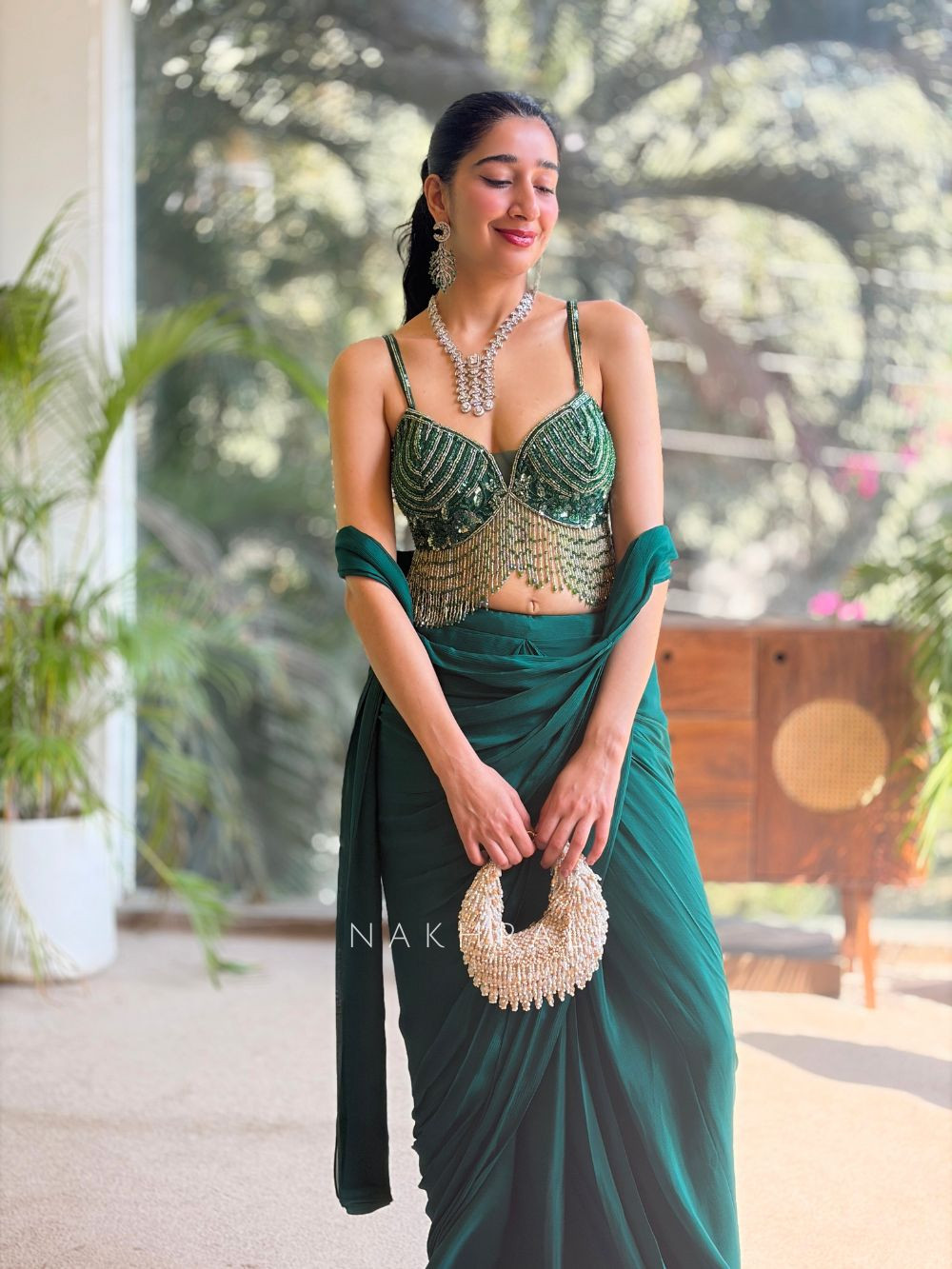 This emerald green ready-to-drape saree set is designed for effortless glamour and modern elegance. The pre-stitched drape ensures a flawless fall while offering comfort and ease of wear. The highlight of the set is its intricately handcrafted blouse, detailed with dense beadwork, shimmering sequins, and cut dana embellishments that create a rich, sculpted look. The blouse features a structured fit with delicate straps, perfectly balancing bold craftsmanship with a refined silhouette. Ideal for cocktail evenings, sangeet functions, festive celebrations, and modern wedding events, this set delivers impact without overwhelming the look.