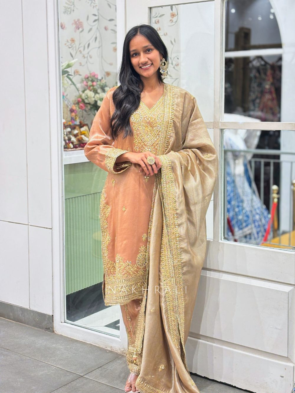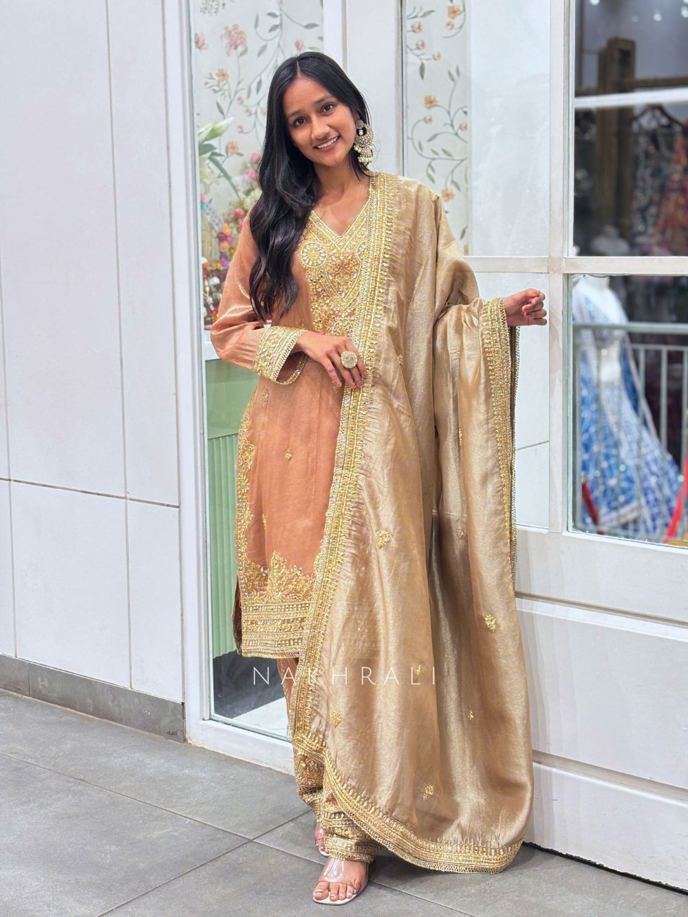 Designed in a lustrous silk base, this elegant suit set showcases detailed zari and sequin embroidery arranged in a statement V-pattern neckline and ornate motifs across the kurta. The sleeves and hem are enhanced with heavy embroidered borders, adding structure and regal depth. The matching pants feature traditional motif work near the hem, while the dupatta is finished with intricate zari edging that elevates the entire look. Perfectly balanced between richness and refinement, this ensemble is ideal for wedding festivities, festive gatherings, and special family celebrations.