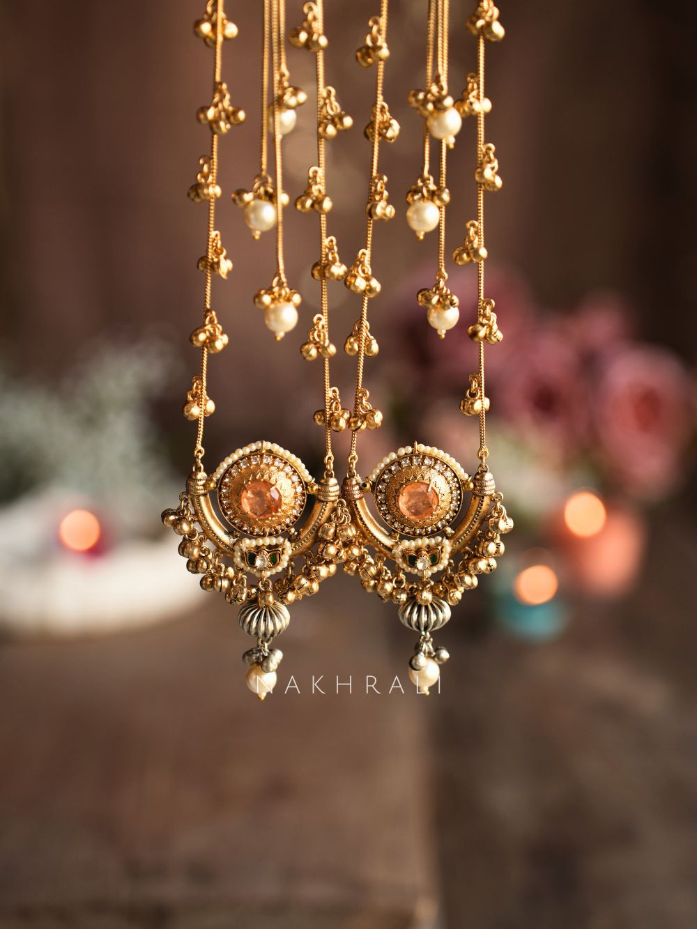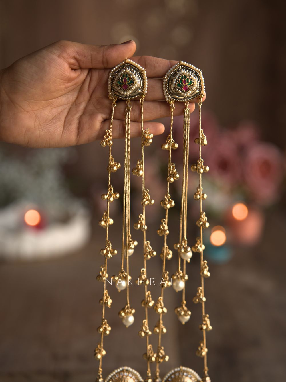 These Kashmiri-inspired statement earrings feature an ornate antique gold base with intricate floral and vine detailing. The design highlights deep ruby-toned center stones framed with delicate pearl accents, complemented by subtle green enamel work that adds depth and contrast. Long cascading chains finished with classic jhumka drops and pearl clusters create graceful movement with every step, making these earrings a perfect blend of heritage craftsmanship and dramatic elegance for weddings and festive occasions.
