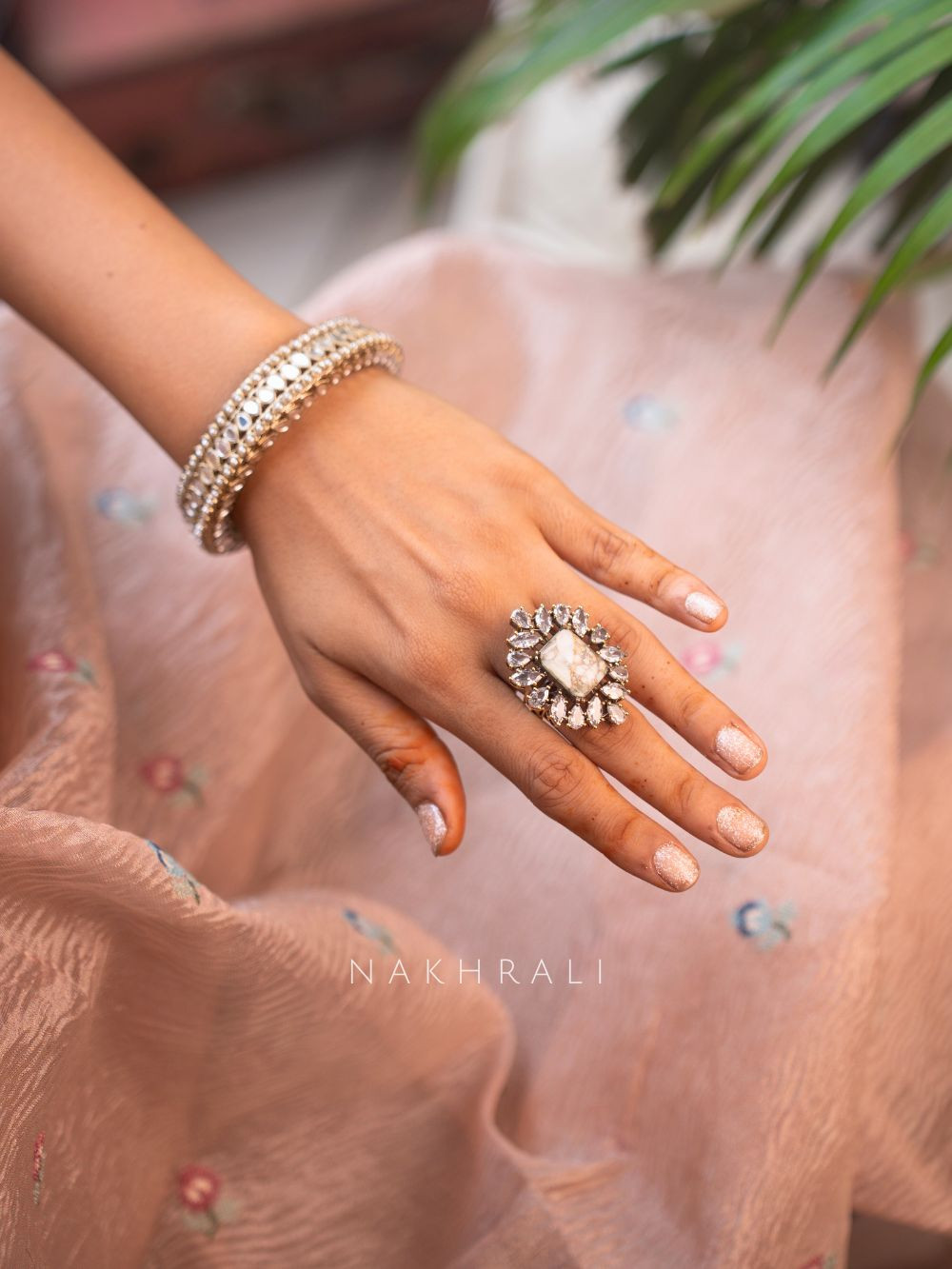 The Zeenat Blue & White Stone-Studded Adjustable Ring blends regal charm with contemporary elegance. Available in two stunning variants — sapphire blue and pearl white — each ring features a bold centerpiece framed by glimmering crystal petals in a floral design. Its adjustable band offers both comfort and versatility, making it a perfect pick for festive occasions, weddings, or evening soirees. A must-have accessory for those who adore graceful, standout jewellery.