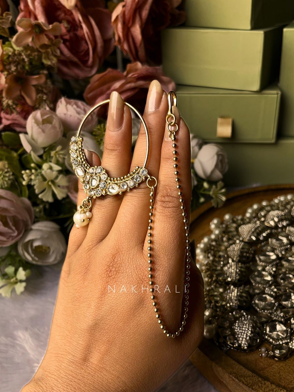 This bridal jewellery set is crafted in rich antique gold tones with intricate polki-style stone work and pearl detailing that adds depth and grandeur. The set includes a bold necklace with layered motifs, coordinated earrings with pearl drops, a traditional nose ring, an elegant matha patti and two matching rings to complete the ensemble. Designed to elevate bridal looks for weddings, receptions and heritage celebrations, this set balances traditional craftsmanship with a luxurious finish that photographs beautifully and pairs effortlessly with lehengas and heavy sarees.