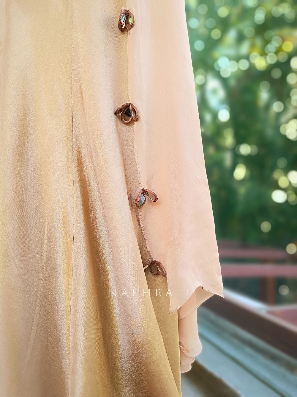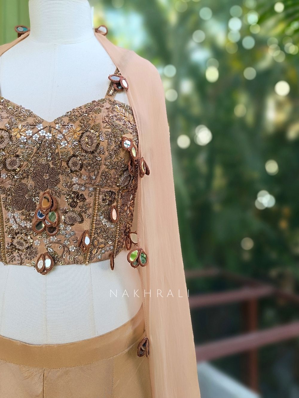 Designed for a sophisticated and elevated appeal, this beige indo-western set features a structured corset-style blouse paired with flowy palazzo pants. The corset is intricately adorned with detailed bead and sequin work, creating a rich, textured surface that adds depth and subtle shimmer. The fitted silhouette of the corset enhances the waistline, while the delicate straps and structured design provide a flattering and modern shape. The embellishments are thoughtfully distributed to maintain a luxurious yet balanced look without appearing overly heavy. The palazzo pants flow effortlessly, offering comfort and ease of movement while complementing the structured top. The soft dupatta, finished with subtle detailing, adds a graceful touch and completes the ensemble.