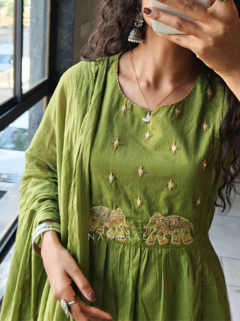 Zenvor Green Anarkali Suit Set with Elephant Embroidered Waist Panel