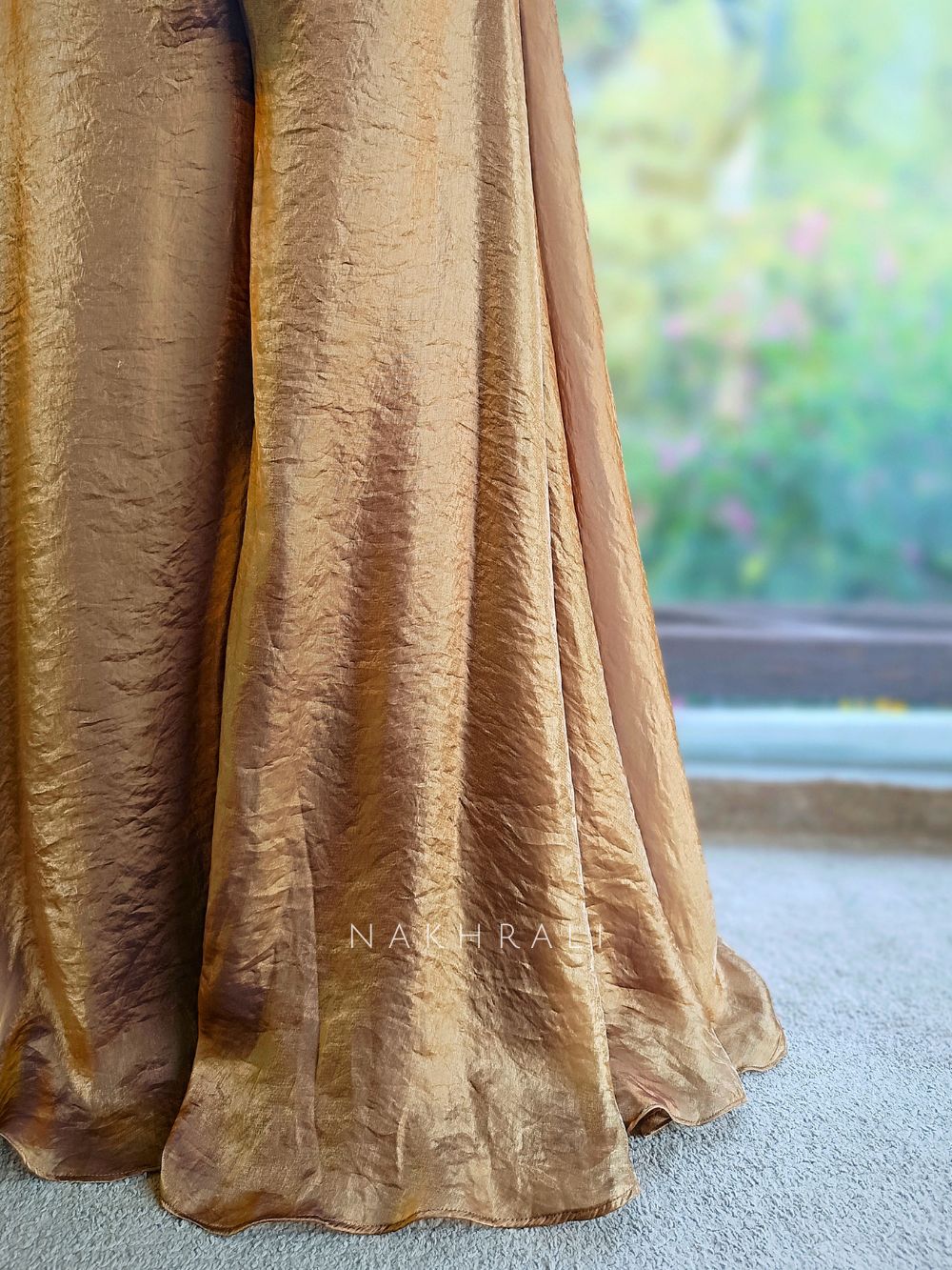 This brown Indo-western palazzo set is designed with a softly structured embroidered top featuring intricate detailing across the bodice. The peplum-style layering adds movement and dimension, creating a flattering silhouette. Paired with wide-leg palazzo pants that flow effortlessly, the outfit balances structure with ease. The coordinated dupatta completes the look with subtle elegance, making it suitable for festive gatherings, intimate functions and contemporary celebrations.