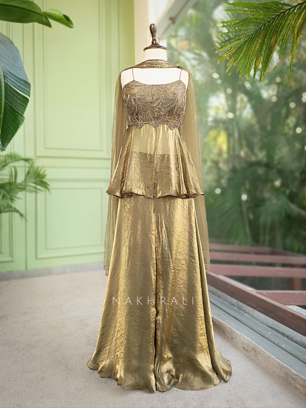 This Green Indo-western palazzo set is designed with a softly structured embroidered top featuring intricate detailing across the bodice. The peplum-style layering adds movement and dimension, creating a flattering silhouette. Paired with wide-leg palazzo pants that flow effortlessly, the outfit balances structure with ease. The coordinated dupatta completes the look with subtle elegance, making it suitable for festive gatherings, intimate functions and contemporary celebrations.