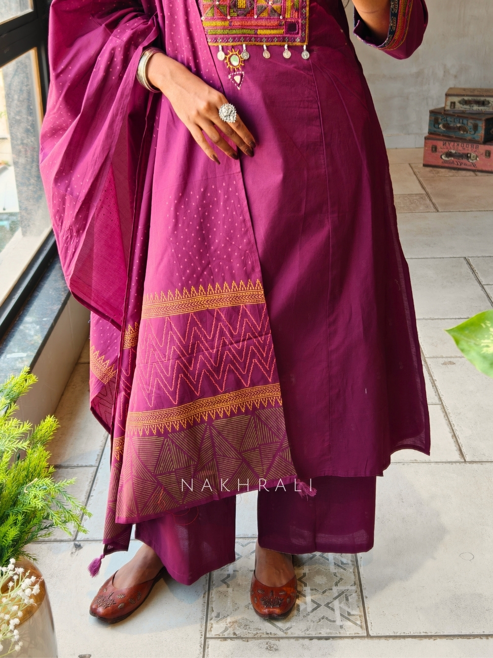 Zerith Solid Wine Kurta Pant Set with Phulkari Embroidered Yoke