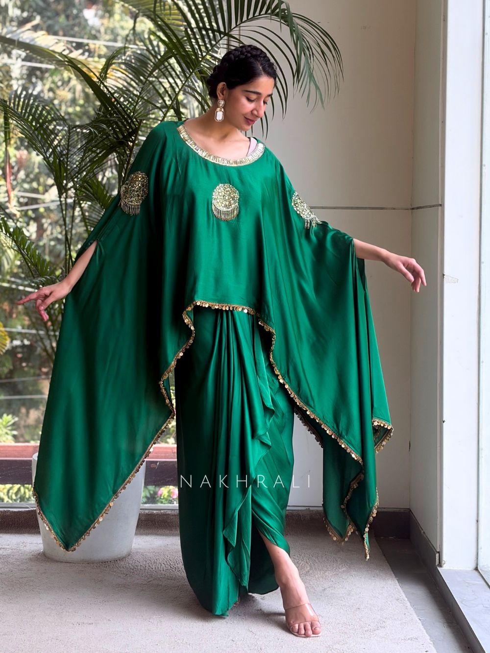 This indo-western ensemble features a flowy kaftan-style top designed with a relaxed silhouette and asymmetrical hemline, offering effortless movement and comfort. The neckline and front are highlighted with mirror and sequin embellishments, adding a festive shimmer. Paired with a draped bottom that mimics saree-inspired pleating, the outfit creates a contemporary fusion look. Such kaftan silhouettes are known for their fluid drape and ease of wear, making them ideal for modern celebrations.