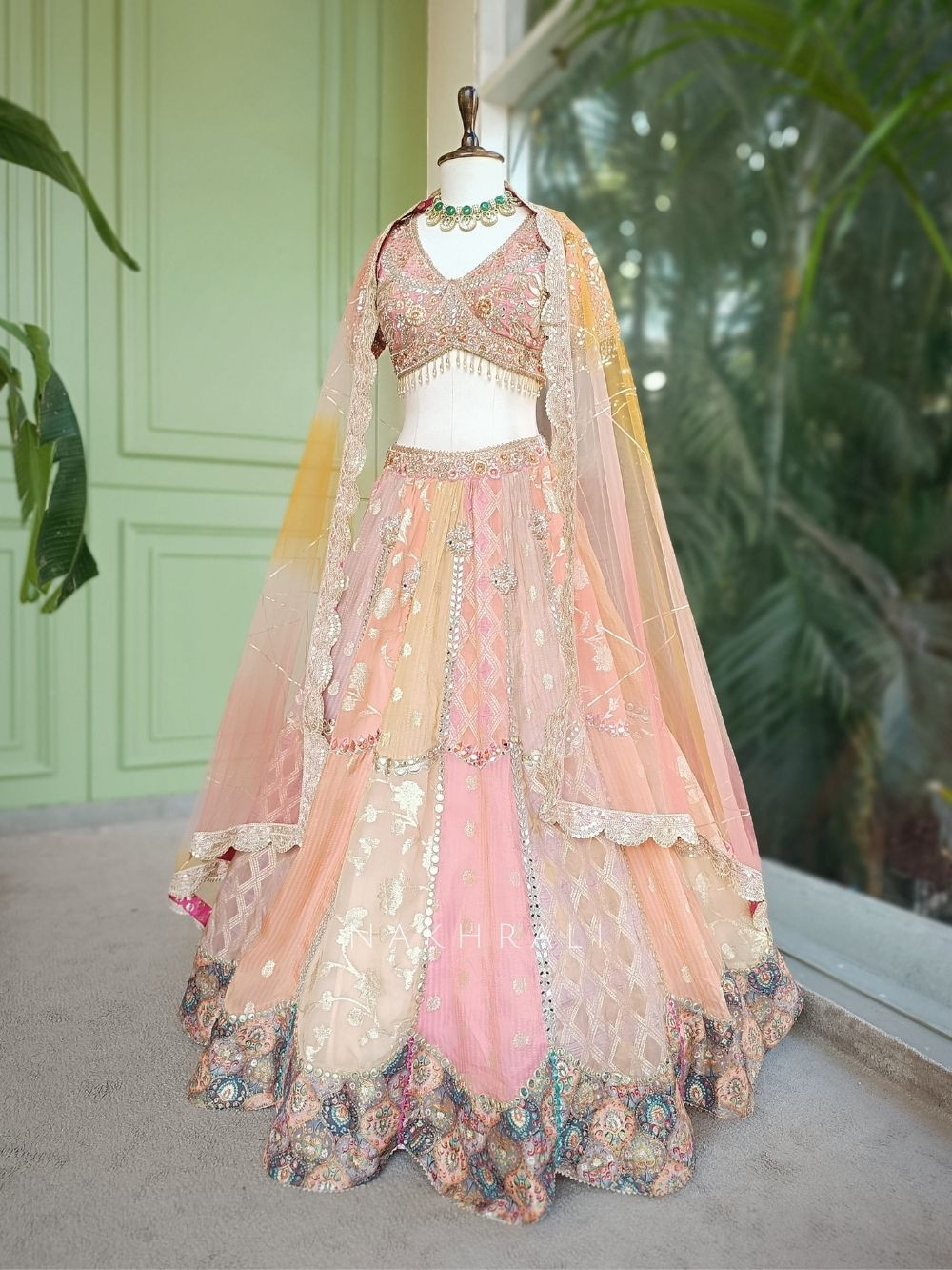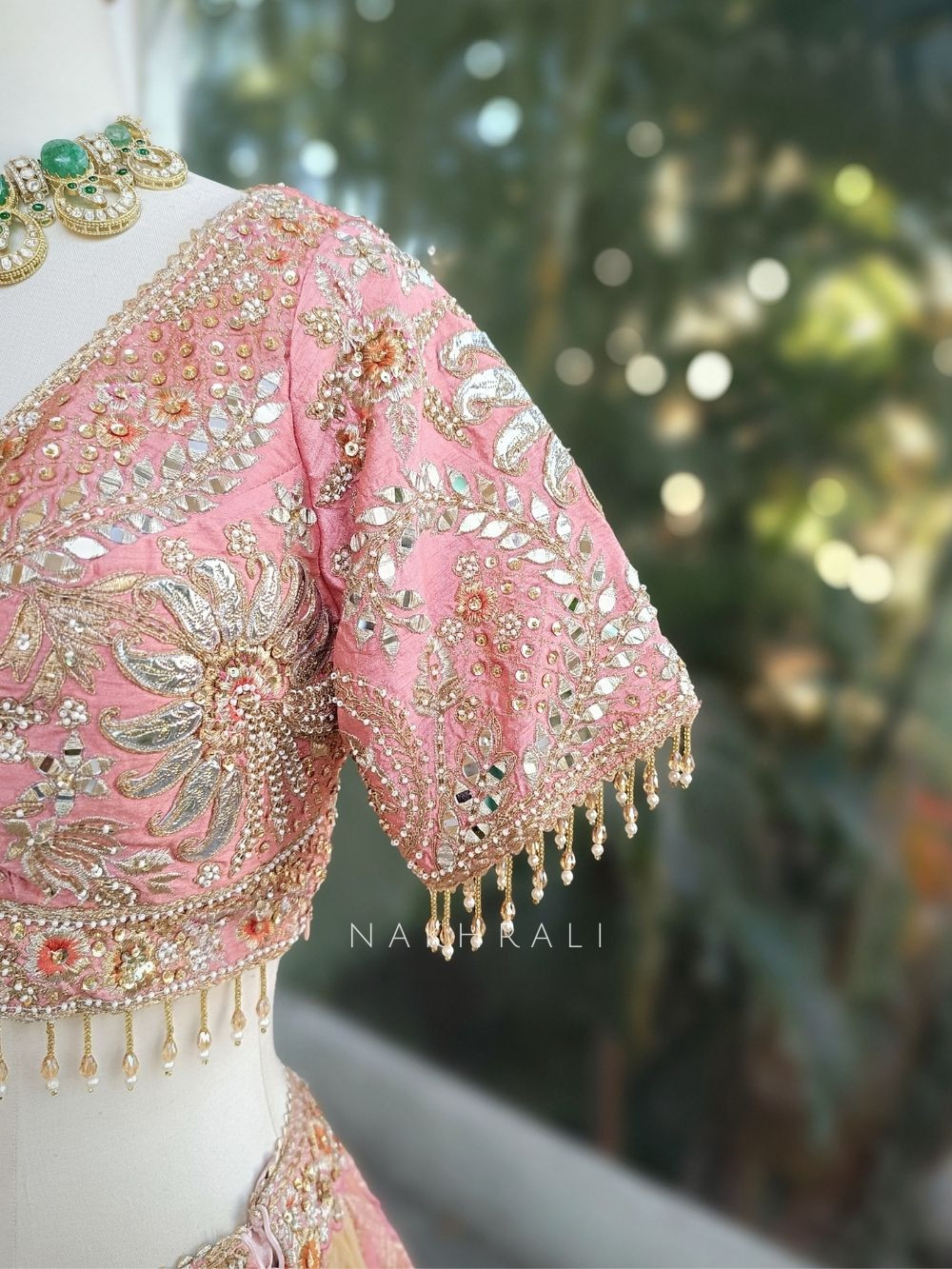 This peach lehenga set stands out for its refined mirror and gota embroidery arranged in delicate floral and geometric patterns across the skirt. The blouse is detailed with dense handwork, subtle shimmer, and a flattering neckline that balances tradition with modern styling. Finished with hanging accents and paired with a lightweight net dupatta, this set feels graceful without being overwhelming—ideal for weddings, festive evenings, and intimate celebrations where detail matters more than drama.