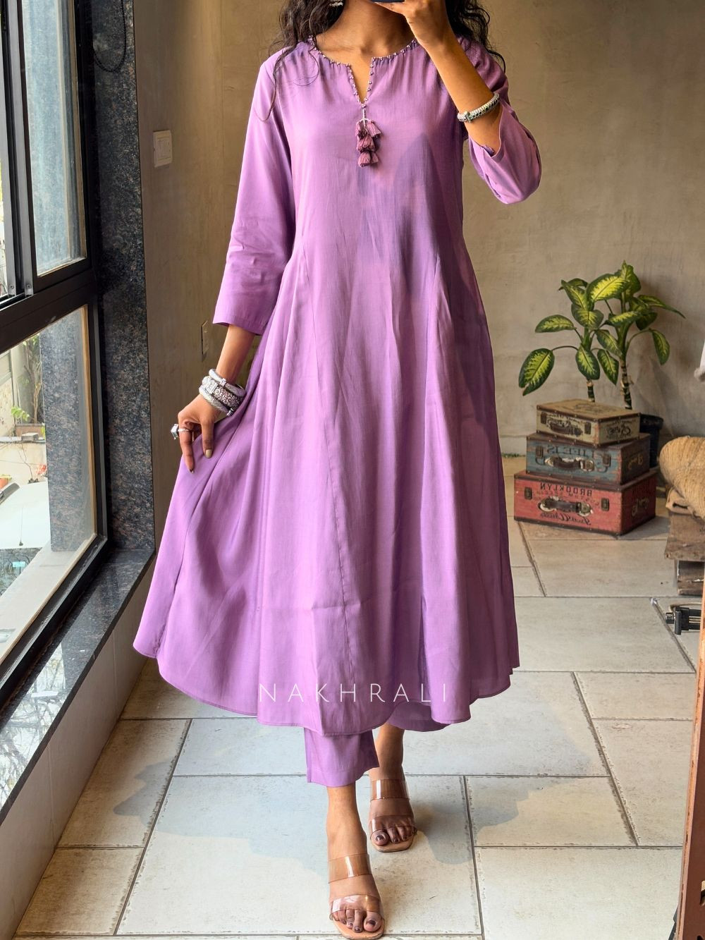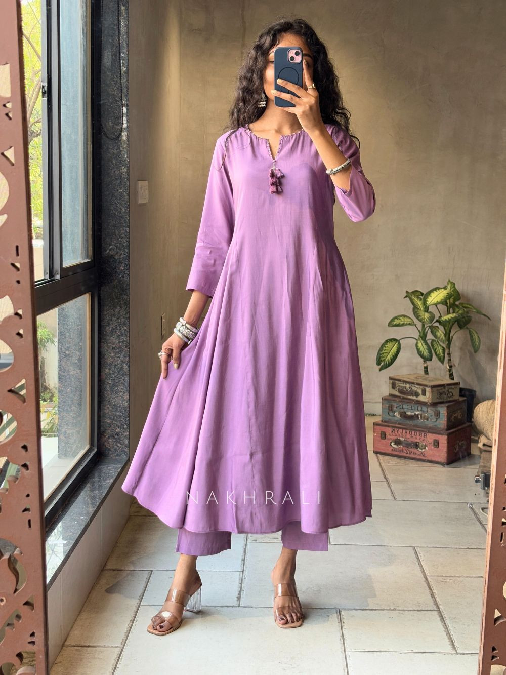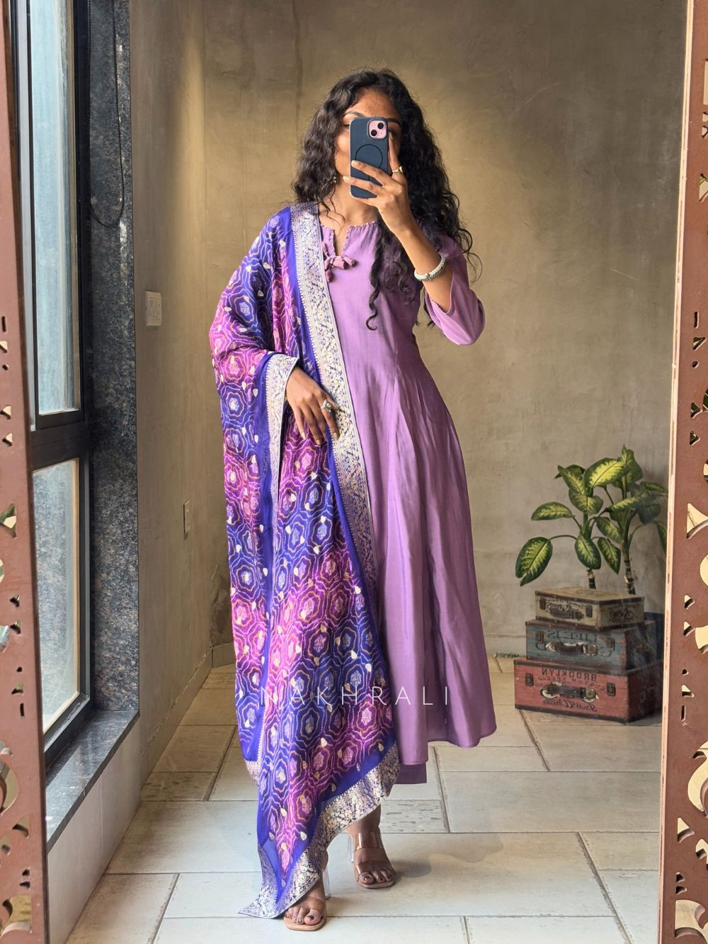 This Anarkali set features a soft, fluid silhouette with a flattering flare that moves gracefully with the body. The kurta is designed to feel light and breathable while maintaining a refined fall. Paired with a statement dupatta featuring rich patterns and borders, the set feels complete and thoughtfully styled without being heavy. Ideal for women who prefer comfort with polish, this outfit transitions easily from day gatherings to festive occasions while keeping the look elegant and easy to wear.
