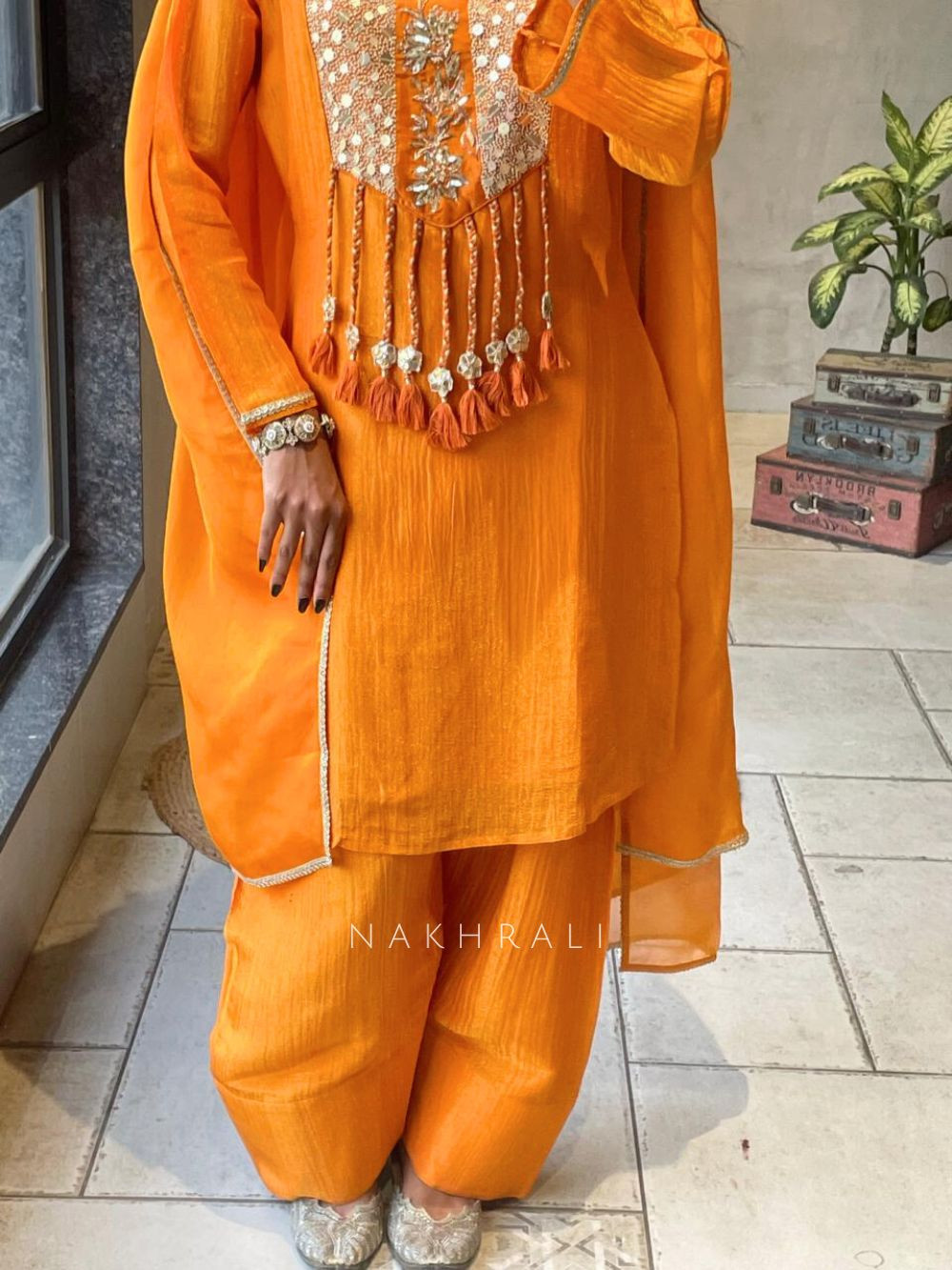 This suit set showcases a rich tone enhanced by detailed embroidery on the kurta neckline, creating a focal point of elegance and craftsmanship. The subtle texture across the fabric adds depth, while the tassel detailing brings a touch of playful sophistication. Paired with coordinated bottoms and a lightweight dupatta with minimal border detailing, this ensemble offers a balanced blend of comfort and festive appeal. Ideal for small celebrations, festive gatherings, and day-to-evening occasions where understated elegance stands out.