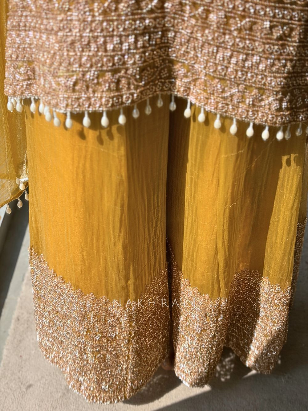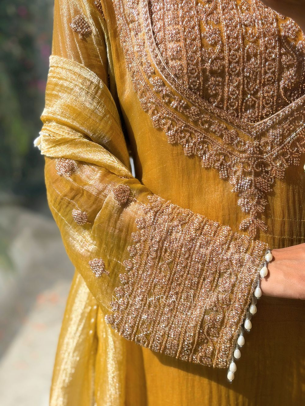 This refined suit set is crafted in luminous tissue fabric, giving it a graceful sheen that feels light yet festive. The kurta features intricate zari thread work enriched with sequin and cut dana embellishments along the neckline, creating a rich focal point without overpowering the look. Matching detailing continues on the kurta hemline and the palazzo borders, bringing balance and harmony to the overall design. Finished with coordinated elements, this set is ideal for festive gatherings, intimate celebrations, and elegant daytime functions where understated luxury stands out.