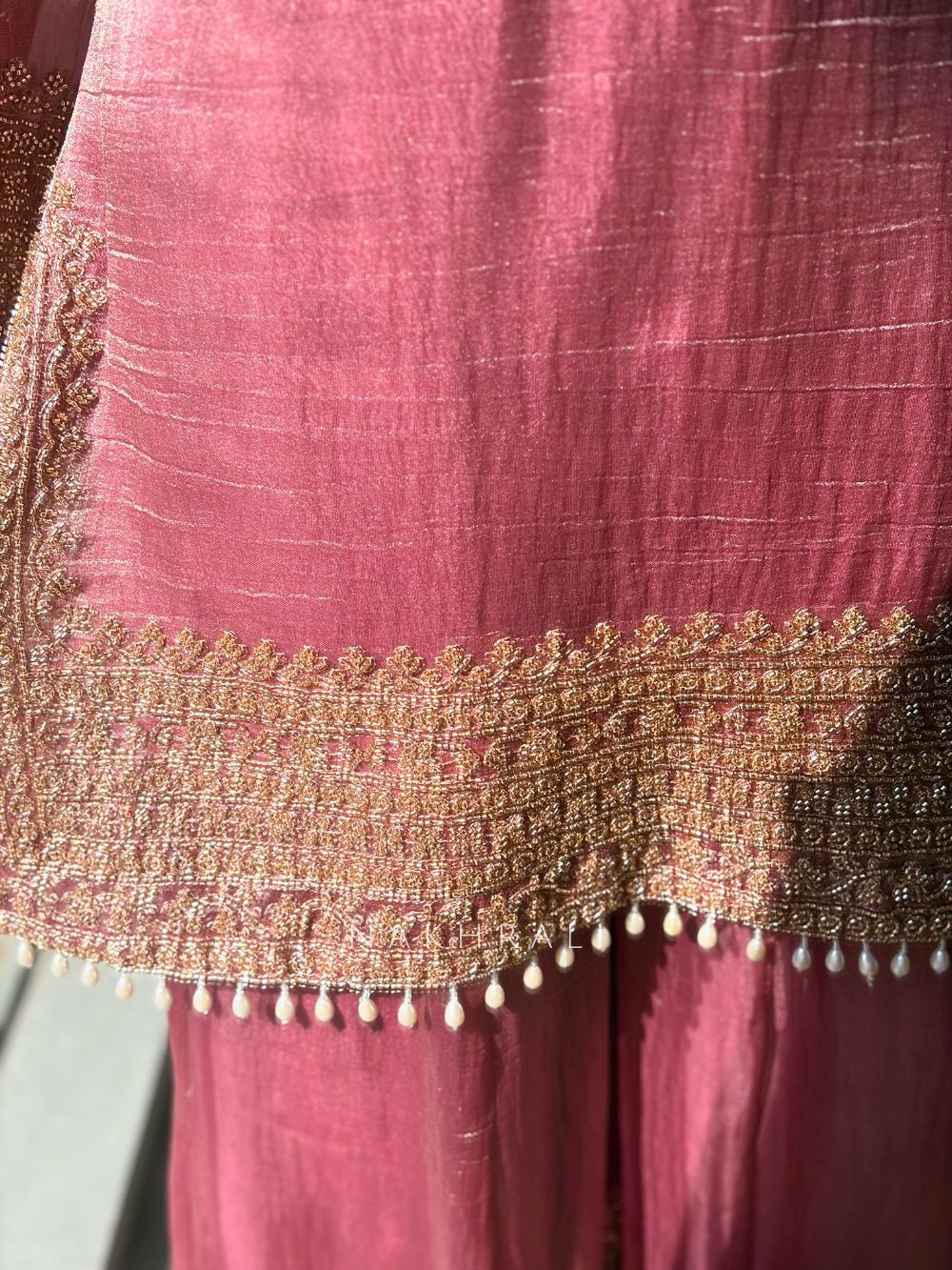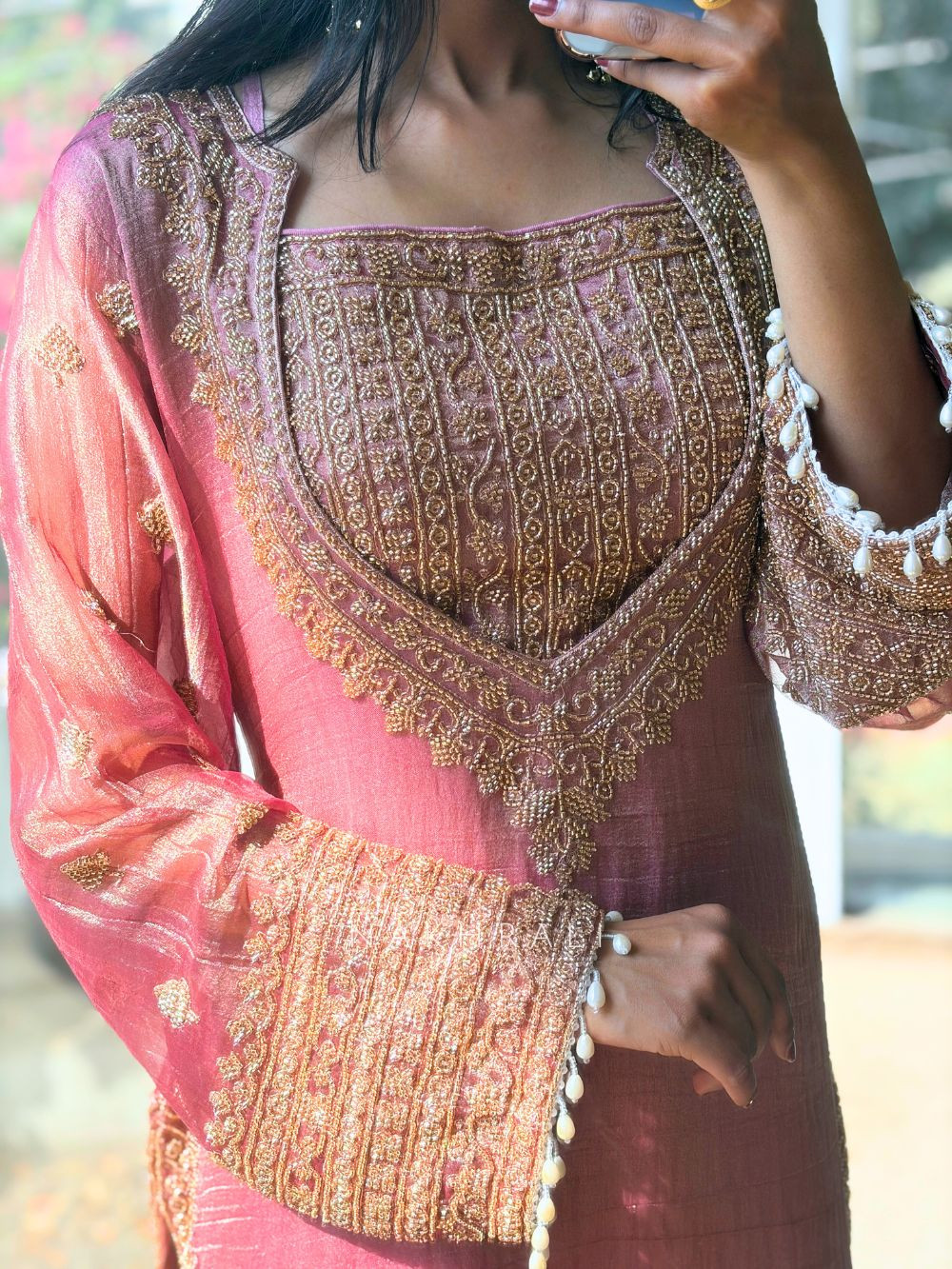 This refined suit set is crafted in luminous tissue fabric, giving it a graceful sheen that feels light yet festive. The kurta features intricate zari thread work enriched with sequin and cut dana embellishments along the neckline, creating a rich focal point without overpowering the look. Matching detailing continues on the kurta hemline and the palazzo borders, bringing balance and harmony to the overall design. Finished with coordinated elements, this set is ideal for festive gatherings, intimate celebrations, and elegant daytime functions where understated luxury stands out.