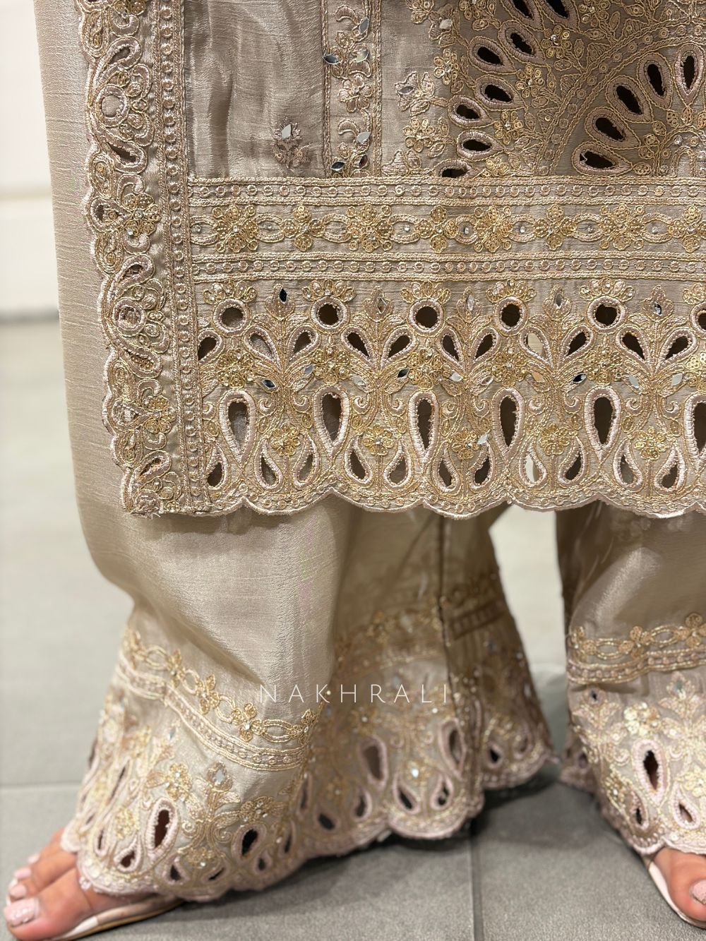 This three piece suit set is crafted with detailed cutwork embroidery enhanced by subtle mirror work across the kurta, sleeves, and hem. The neckline stands out with dense embroidery, while fine motifs are spread across the body for a balanced look. The coordinated bottoms feature matching cutwork detailing at the hem, and the dupatta completes the ensemble with complementary embroidery, adding flow and refinement. A versatile choice for festive gatherings, family occasions, and elegant evening events.