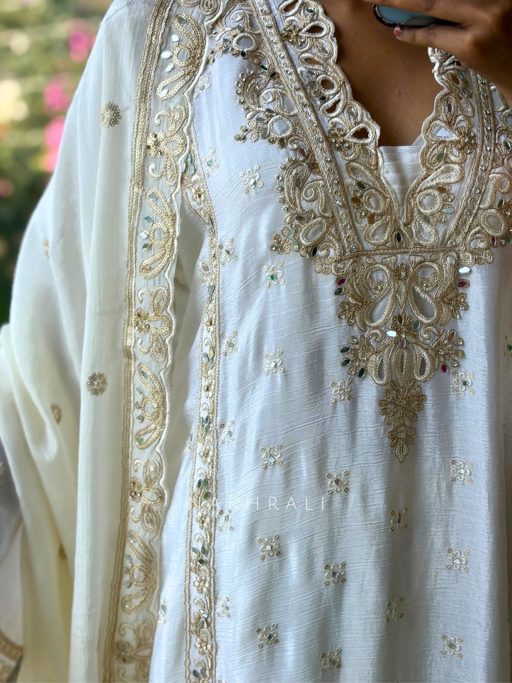 Zymera Off White Three Piece Suit Set with Cutwork and Mirror Embroidery