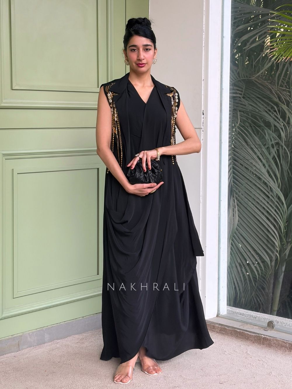 This black draped dress is crafted with a fluid silhouette that falls gracefully, creating a refined yet dramatic look. The highlight is the jacket-style front panel adorned with metallic embellishments that add depth and visual interest without overpowering the design. The sleeveless structure balances structure and ease, while the draped construction enhances movement and elegance. Ideal for cocktail evenings, festive nights, and statement occasions where minimal effort meets high impact.