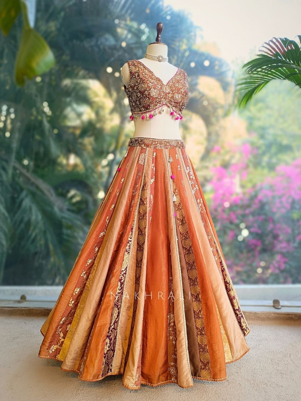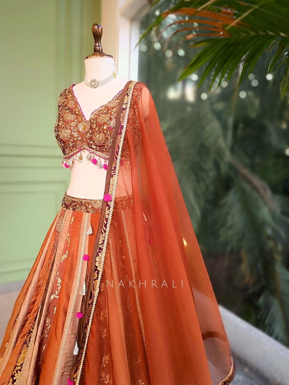 This brown lehenga set stands out with its detailed zari and sequin work that adds depth and richness to the overall look. The lehenga features panelled detailing with ornamental motifs, while the blouse is designed with matching embellishment and delicate hanging accents for added movement. The coordinated dupatta completes the ensemble, creating a balanced blend of traditional craftsmanship and modern styling. Ideal for weddings, festive gatherings and special celebrations where elegance is key.